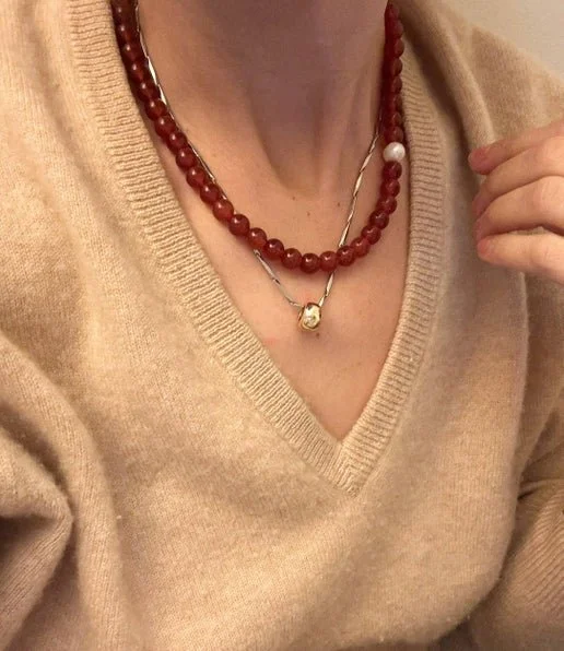 Vibrant carnelian beads with an off-center freshwater pearl accent. An elegant option for a subtle pop of color.